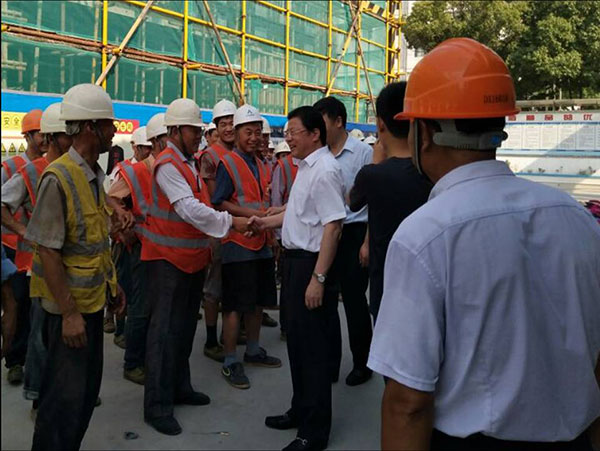 在施工現場,顧縣長看望了在高溫酷暑下作業的一線施工人員,親切和工人們握手,送上防暑降溫用品,對職工們的辛勤勞動表示由衷地感謝,并再三叮囑工人們在高溫天氣要注意身體,合理安排作息時間,切實做好防暑降溫和安全生產工作。