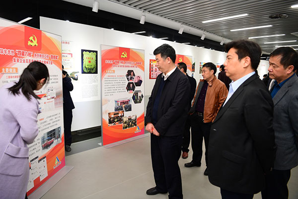 在達欣集團企業展示中心,嚴長江一行參觀了“筑牢思想‘四梁八柱’ 爭創燎原工程‘魯班獎’”主題展板,詳細了解了企業黨員冬訓工作開展情況,對黨建工作的創新做法給予了肯定。集團董事長、黨委副書記馬和軍陪同參觀。