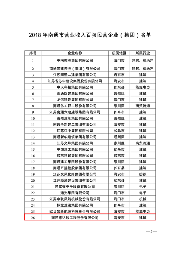 4月23日,南通市工業和信息化局發布關于2018年南通市營業收入百強民營企業(集團)情況的通報。南通市達欣工程股份有限公司以出色的業績榮登百強企業榜單,列26位,排名海安第5位(海安共有26家入圍)。