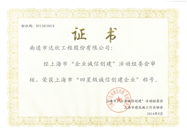 日前,由上海市建筑施工行業(yè)協(xié)會(huì)推薦,上海市“企業(yè)誠信創(chuàng)建”活動(dòng)組委會(huì)審核,第三方征信機(jī)構(gòu)嚴(yán)格查證,第一工程公司在2013年榮獲“三星級(jí)誠信創(chuàng)建企業(yè)”后,今年再加一顆星,被授予上海市“四星級(jí)誠信創(chuàng)建企業(yè)”稱號(hào)。