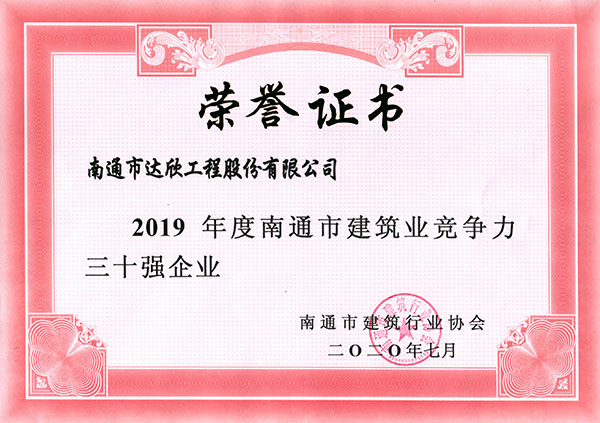 根據《關于開展2019年度南通市建筑業“雙三十強”及“三優”評價工作的通知》(通建協〔2020〕2號),經評審委員會對“雙三十強”企業及“三優”初審結果進行復核、審查,最終公司獲得2019年度南通市建筑業競爭力三十強企業,評價排名第11位,馬和軍同志獲得南通市建筑業優秀企業家,楊靜同志獲得南通市建筑業優秀企業經理。