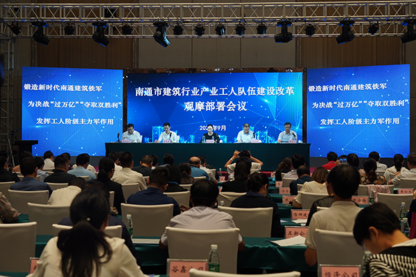 9月17日上午,南通市建筑行業產業工人隊伍建設改革觀摩部署會在達欣集團舉行。南通市總工會黨組書記、副主席、產業工人隊伍建設改革聯席會議辦公室主任葛志娟,南通市住房和城鄉建設局黨組副書記、副局長、一級調研員沈衛星,南通市總工會四級調研員楊紅衛;各(縣)市、區總工會領導、勞動和經濟工作部部長,以及南通市建筑施工特級資質企業、海安市建筑施工一級資質企業負責產改的主要領導等120多人參加觀摩會。海安市委常委、組織部部長、統戰部部長張明星,海安市政協副主席、總工會主席李如生;海安市總工會黨組書記、副主席柴寶清,海安市建管局局長賈伯根等陪同參加;集團董事長馬和軍,黨委書記劉厚純,副總經理、工會主席溫鶴華參加活動。