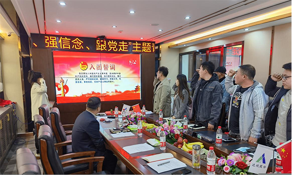 活動首先重溫了入團誓詞,觀看黨的故事100講-五四運動、達欣集團黨史發展紀錄片。隨后,優秀青年代表進行了慷慨激昂的“我為建黨100周年獻禮”發言以及青年突擊隊授旗儀式。為活躍現場氣氛,還進行了擊鼓揚花唱紅歌趣味小游戲。
