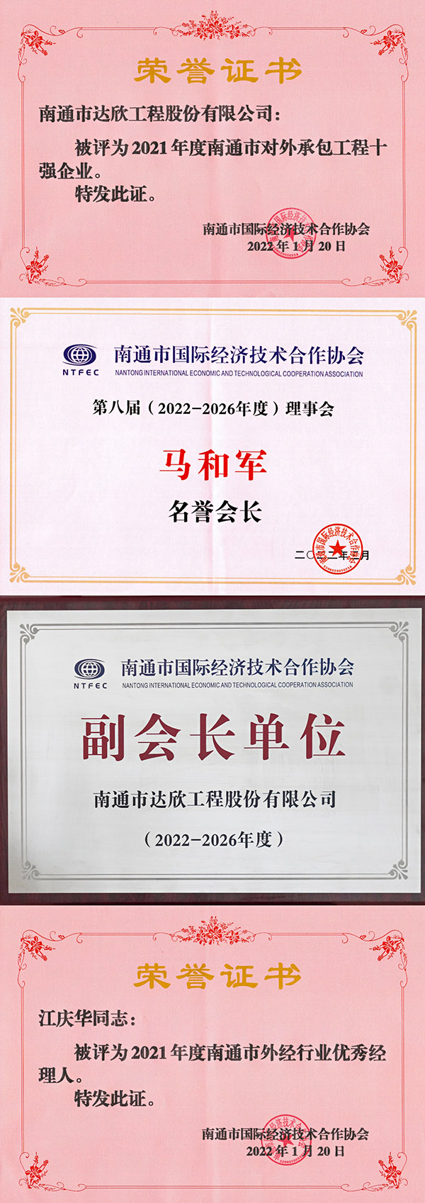 會上,達欣集團被評為2021年度南通市對外承包工程十強企業,董事長馬和軍當選第八屆(2022-2026年度)理事會名譽會長,企業當選為副會長單位,柬埔寨分公司江慶華被評為南通市外經行業優秀經理人。
