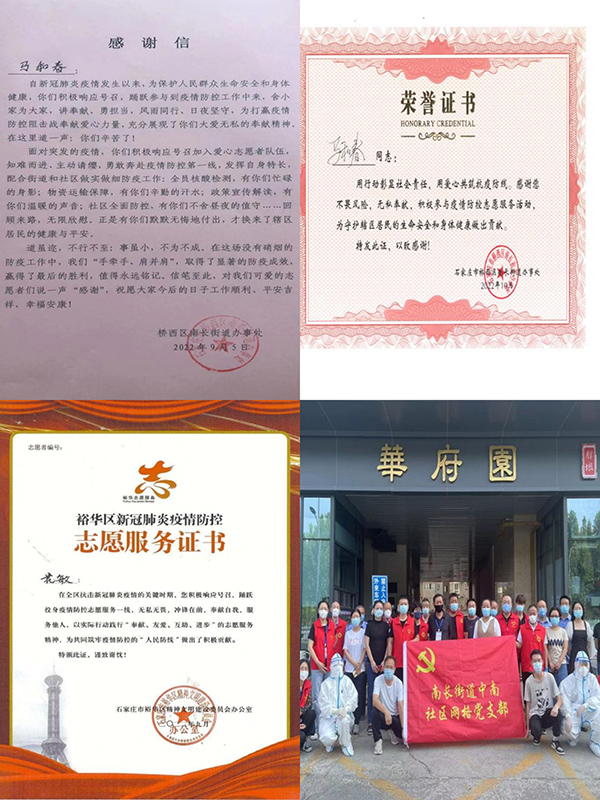近日,第四工程公司陸續(xù)收到來(lái)自石家莊橋區(qū)西區(qū)南長(zhǎng)街道辦事處、裕華區(qū)精神文明建設(shè)委員會(huì)對(duì)馬和春、花敏等同志的感謝信,對(duì)他們?cè)谑仪f市疫情期間,主動(dòng)請(qǐng)纓加入志愿者隊(duì)伍,不懼風(fēng)險(xiǎn)、知難而進(jìn),為社區(qū)物資配送、核酸檢測(cè)、信息統(tǒng)計(jì)、環(huán)境消殺、防控措施宣傳等方面所做的貢獻(xiàn)和展現(xiàn)出的舍小家為大家的無(wú)私、擔(dān)當(dāng)、奉獻(xiàn)精神表示感謝。