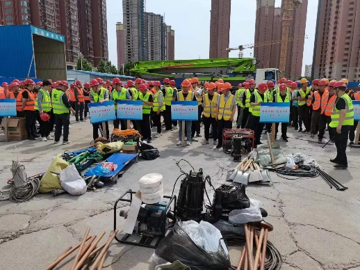第三工程公司接到通知后,以副經理吉祥為組長的應急救援小組及時出動,攜帶水泵、發電機、鐵鍬、頭燈、沙袋、雨靴等防汛物資,參加演練。