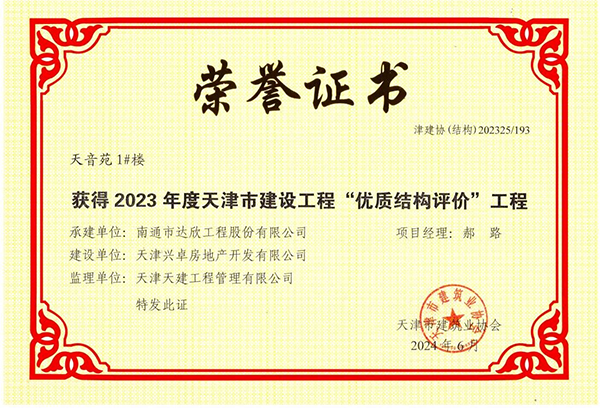 近日,由第六工程公司承建的天音苑1#樓榮獲“2023年度天津市建設工程“優質結構評價”工程。