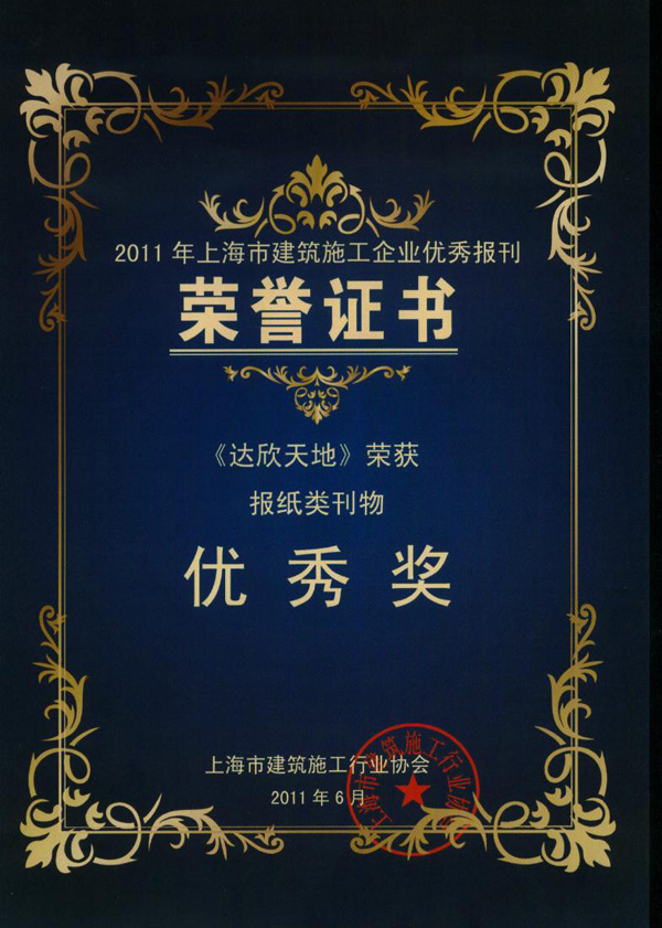 2011年上海市建筑施工企業優秀報刊及協會優秀通訊員表彰會日前召開,由上海市建筑施工企業優秀報刊評委會評選,公司創辦的“達欣天地”報榮獲2011年上海市建筑施工企業優秀報刊獎。