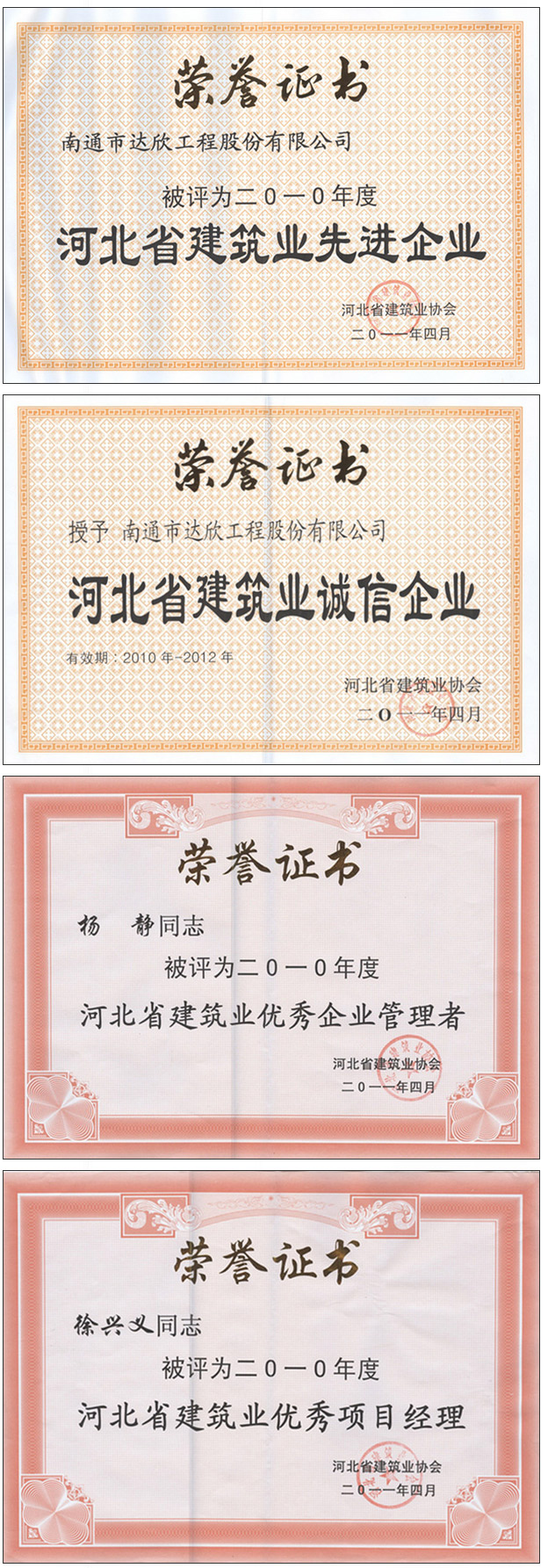 大會對第四工程公司承建的國優工程石家莊中華商務廣場、南通市達欣工程股份有限公司榮獲的全國優秀工程建設QC小組活動企業進行了通報表揚。同時對71家2010年度河北省建筑業誠信企業(江蘇省在冀施工企業僅2家)、106家河北省建筑業先進企業(江蘇省在冀施工企業僅3家)、優秀企業管理者和優秀項目經理進行了表彰和頒獎。