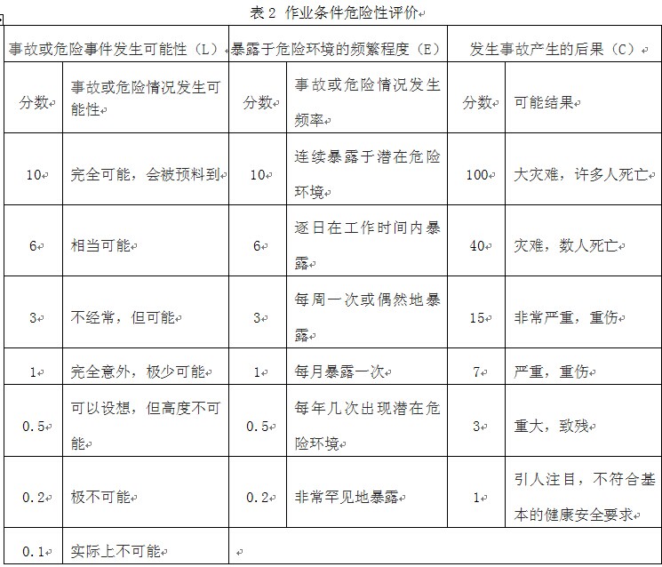 風險等級評估通常采用“作業條件危險性評價法”,根據事故發生的可能性、暴露于危險環境的頻繁程度和事故發生后的后果嚴重程度進行綜合評分,來確定風險等級,如表2。