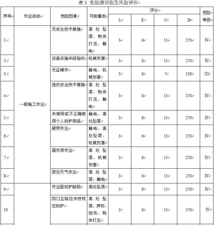 本公司目前在建的主要工程有:重慶直升機投資有限公司項目(包括總裝廠房、交付中心和教學大樓),重慶機床集團搬遷項目(包括廠房、科技大樓、倒班宿舍)。公司針對兩個施工現場特點進行分析,制訂了危險源識別及風險評價表,部分內容如表3。