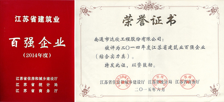 為充分發揮優勢企業在全行業中的引領和示范作用,打造建筑企業品牌,提升核心競爭力,省住房城鄉建設廳、統計局、商務廳成立了“百強企業”認定委員會,本著“尊重事實、嚴格標準、規范程序、公平公正”的原則,組織開展了2014年度建筑業“百強企業”(企業包括總承包綜合實力類、建筑裝飾裝修類、建筑鋼結構類、建筑安裝類、基礎設施類等)認定工作。經評議,公司首度榮登2014年江蘇省建筑業“百強企業”。按照《江蘇省建筑業企業信用綜合評價辦法》(蘇建建管〔2013〕602號)文件精神,自發布之日起的一年內,“百強企業”可在施工企業信用考評中做為省級獎項予以加分。